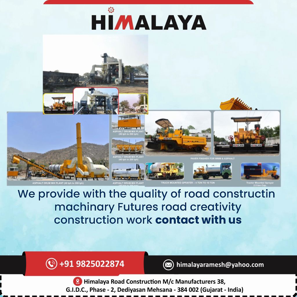 Drum mix Plant all type Capicty# Asphalt Batch Mix Plant 80 To 300 TPh Capicty@Hydro. sensor & mechinecal Paver Finisher up To 5 mtr@Hydro broomer# Truckmounted bitumen Spreyar# trolly mounted spreyar , emlusan use boiler , wood fire boiler all type rang Asphalt Road making gellery making HIMALAYA MAKE MACHINERY ......